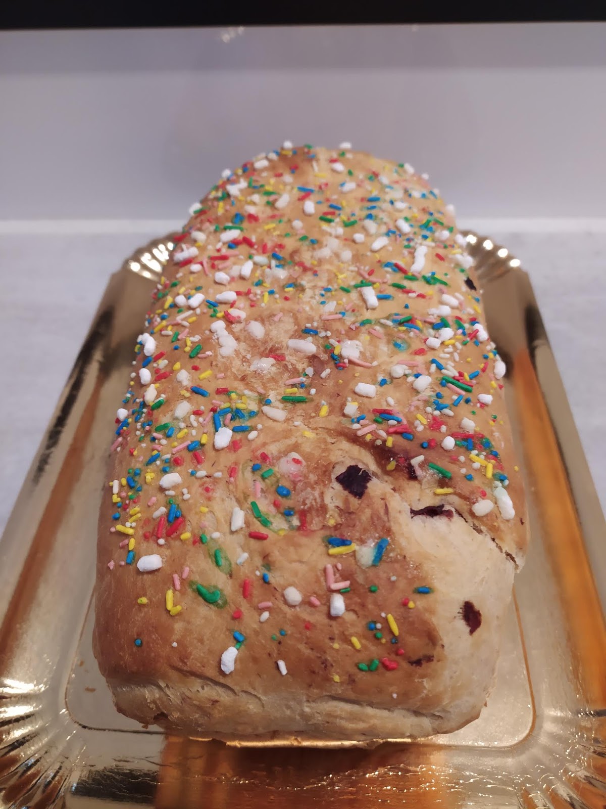 Trascorso il tempo necessario a far sì che sia raddoppiato di volume, metti l'impasto in uno stampo da plumcake e lascia lievitare ancora una mezz'ora. Bagna la superficie con un poco di acqua e cospargi di codette e zuccherini.